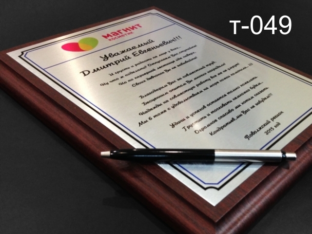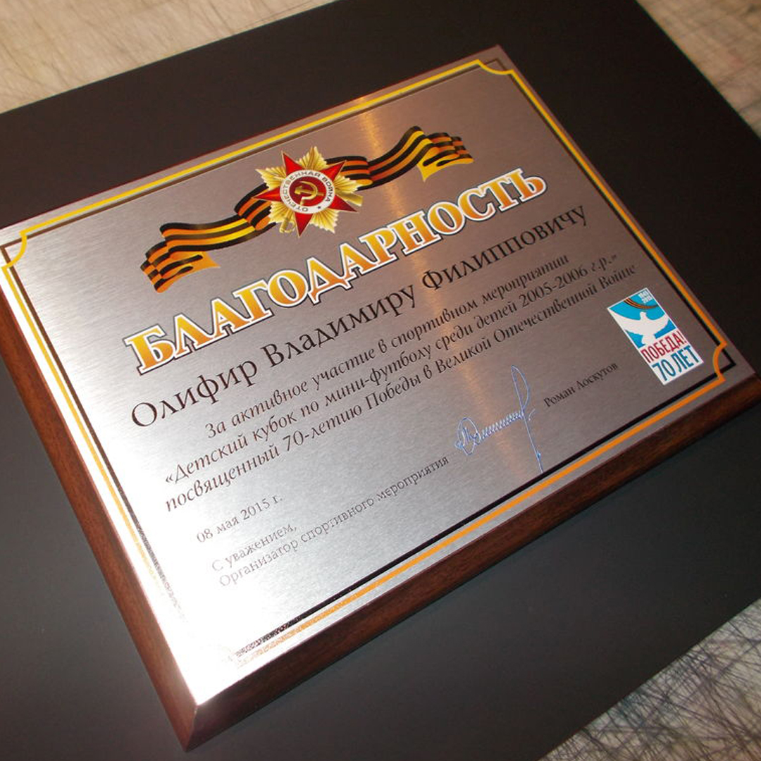 Памятные и наградные таблички. Устойчивая полноцветная печать на металле в комплекте с деревянной плакеткой послужит отличной наградой за участие в соревнованиях. Презентабельный способ благодарности выдающемуся сотруднику или партнеру!
